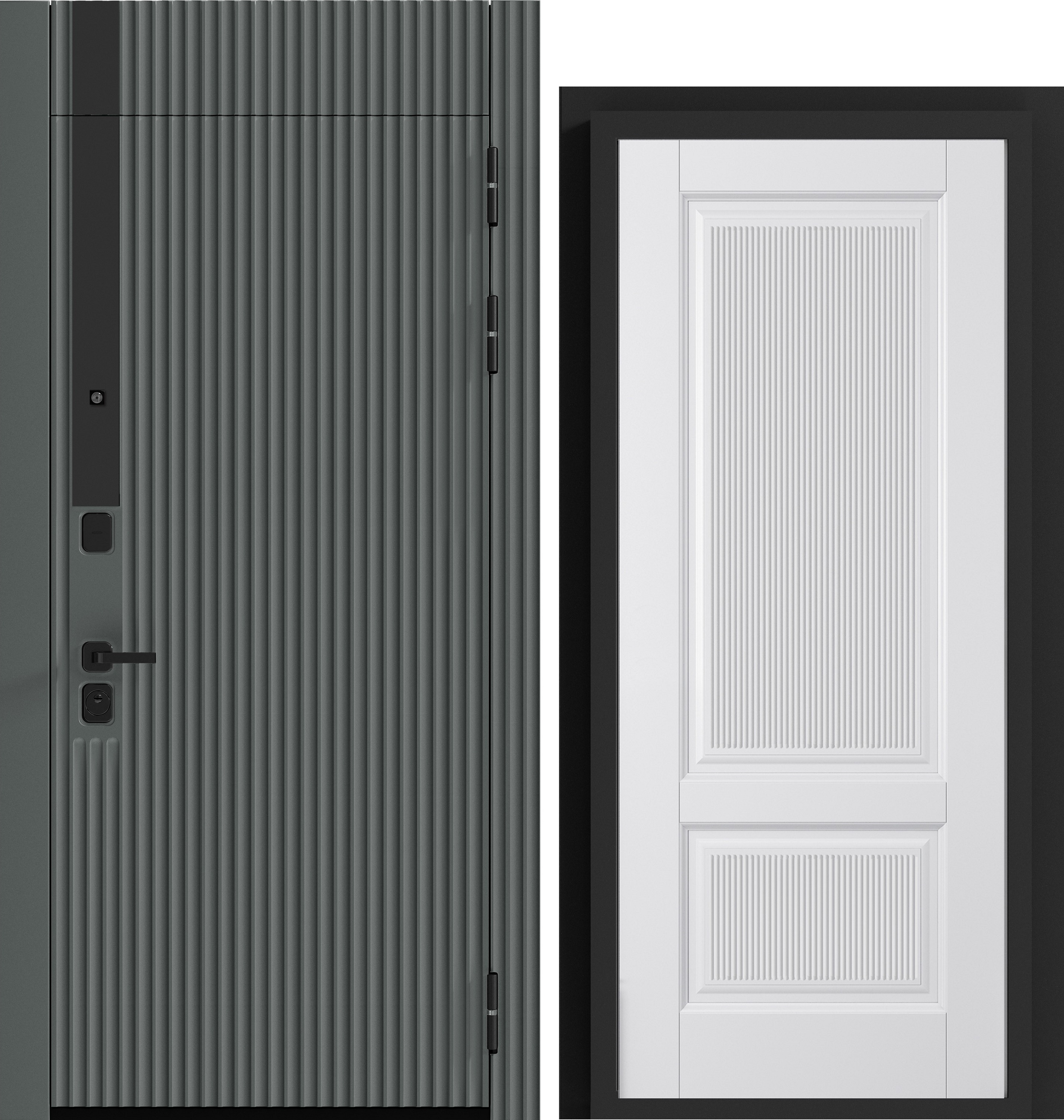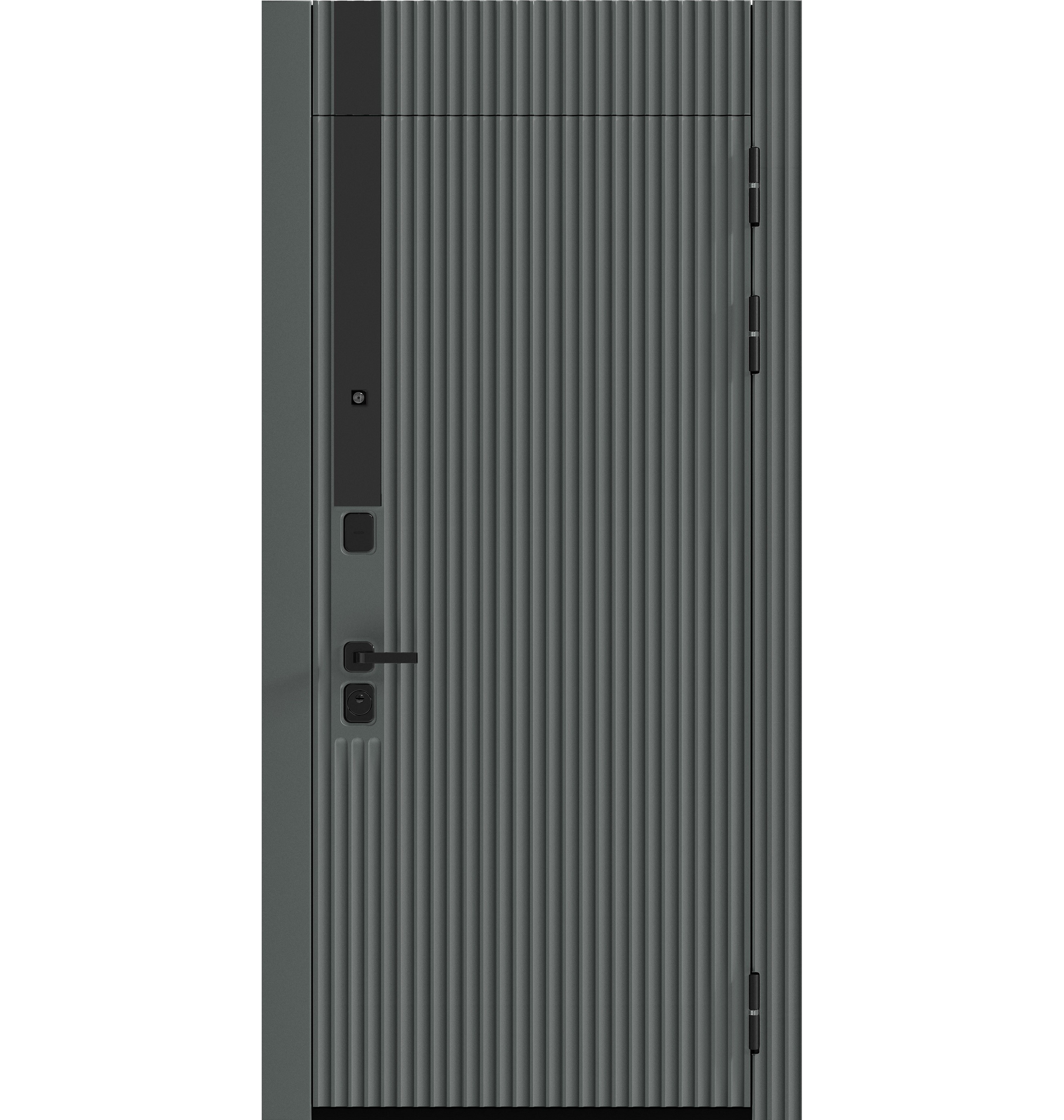 - Наружняя отделка: панель МДФ 16 мм цвет Оскуро рис. Волна с переходом на наличник+вставка металл муар черный (Акзонобель)