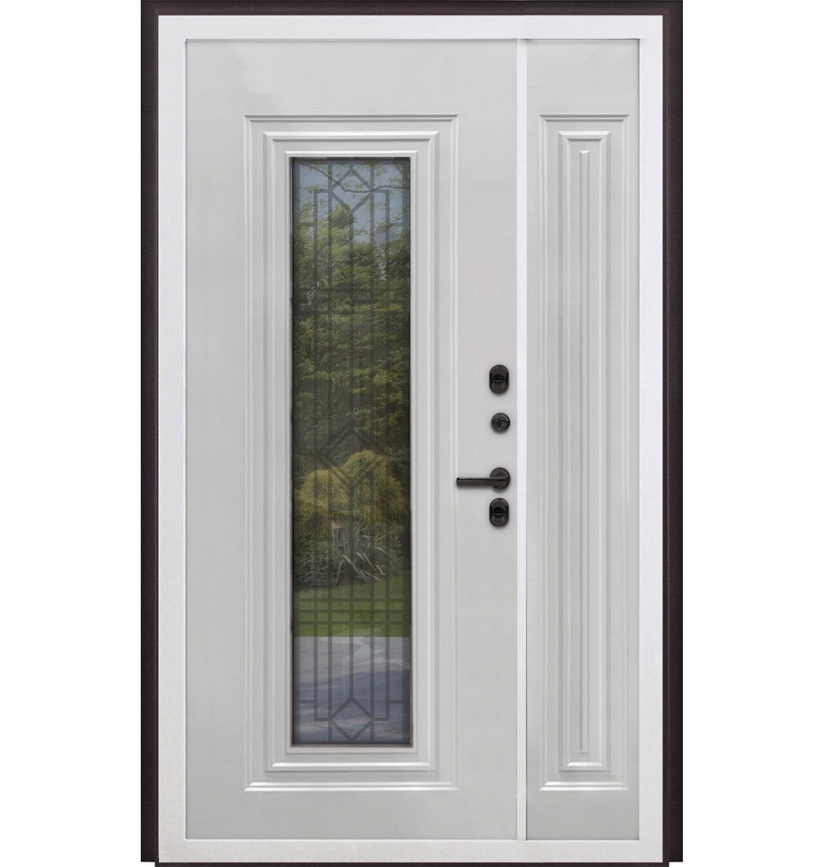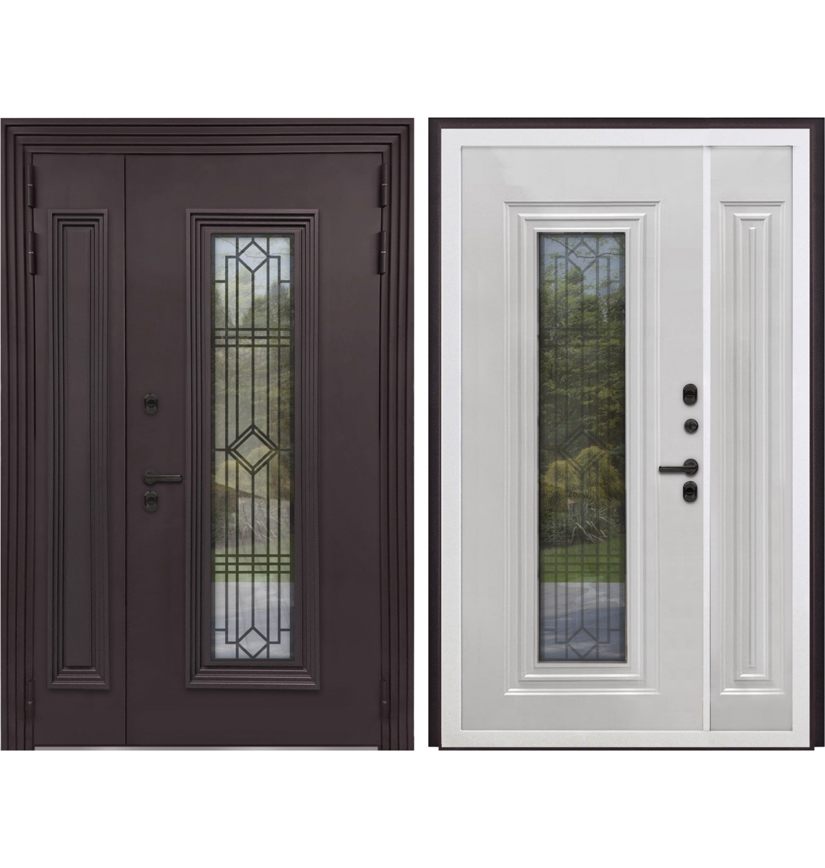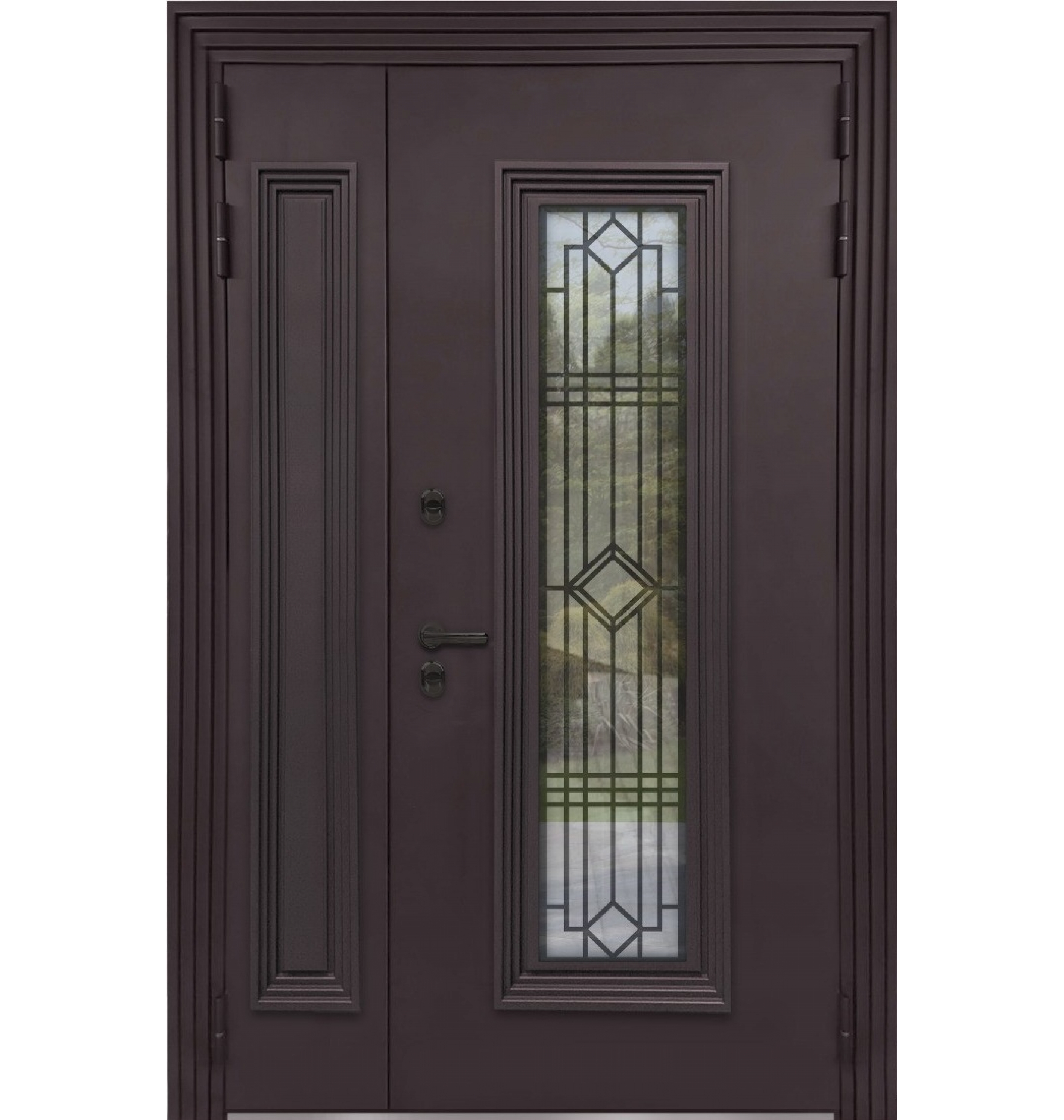 - Наружная отделка: ФМ 1 филенка, багет ЛЕСЕНКА, объемный наличник ПОЛУЛЕСЕНКА, стеклопакет 3 камерный зеркальный, Лазерная резка муар 9005 Паллада