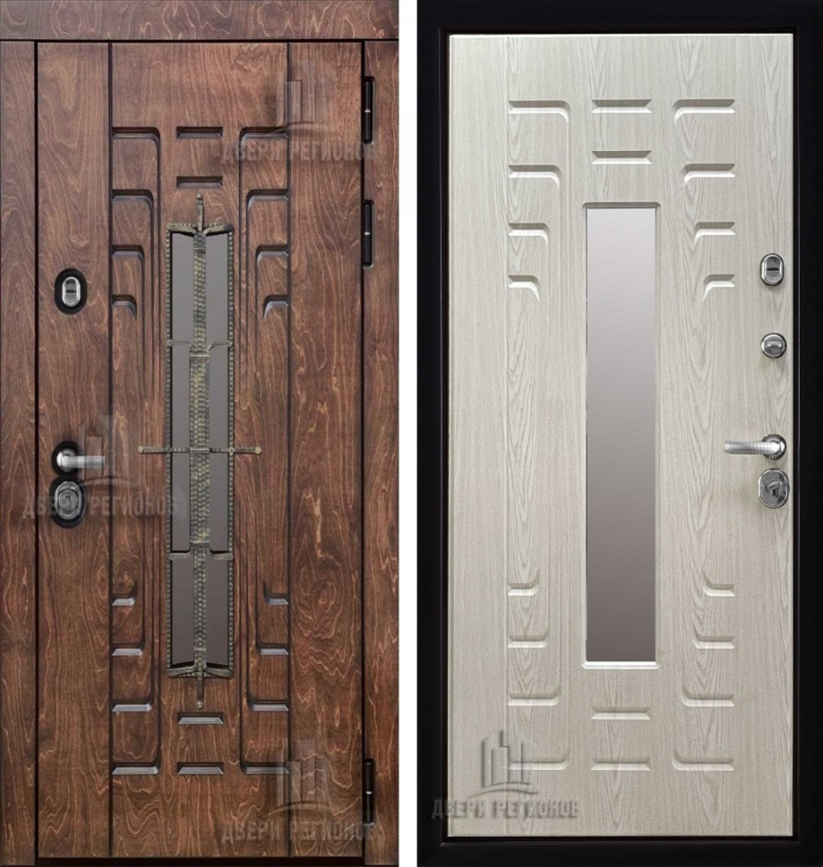 Данная дверь предназначена для установки на улицу, ее отличительной чертой является внешняя отделка "waterproof veneer". Waterproof Veneer - это влагостойкий щит толщиной 18 мм, состоящий из 13 слоёв шпона твёрдых пород дерева, переклеенных между собой фенолформальдегидным клеем, тонируется масло-воском фирмы Borma Wachs производства Италия и покрывается атмосферостойким двухкомпонентным полиуретановым лаком фирмы «KEMICHAL S.R.L.», Италия.