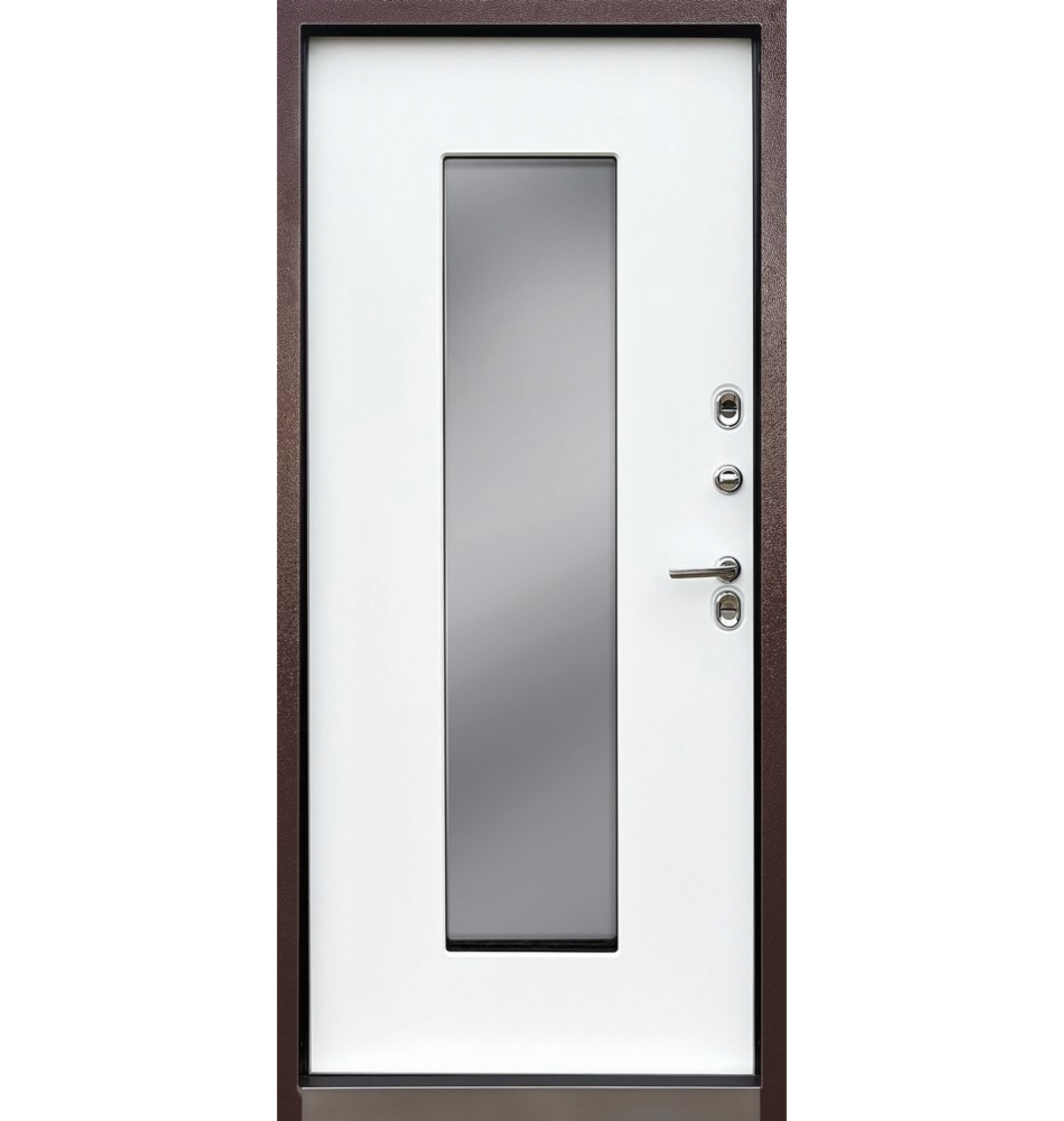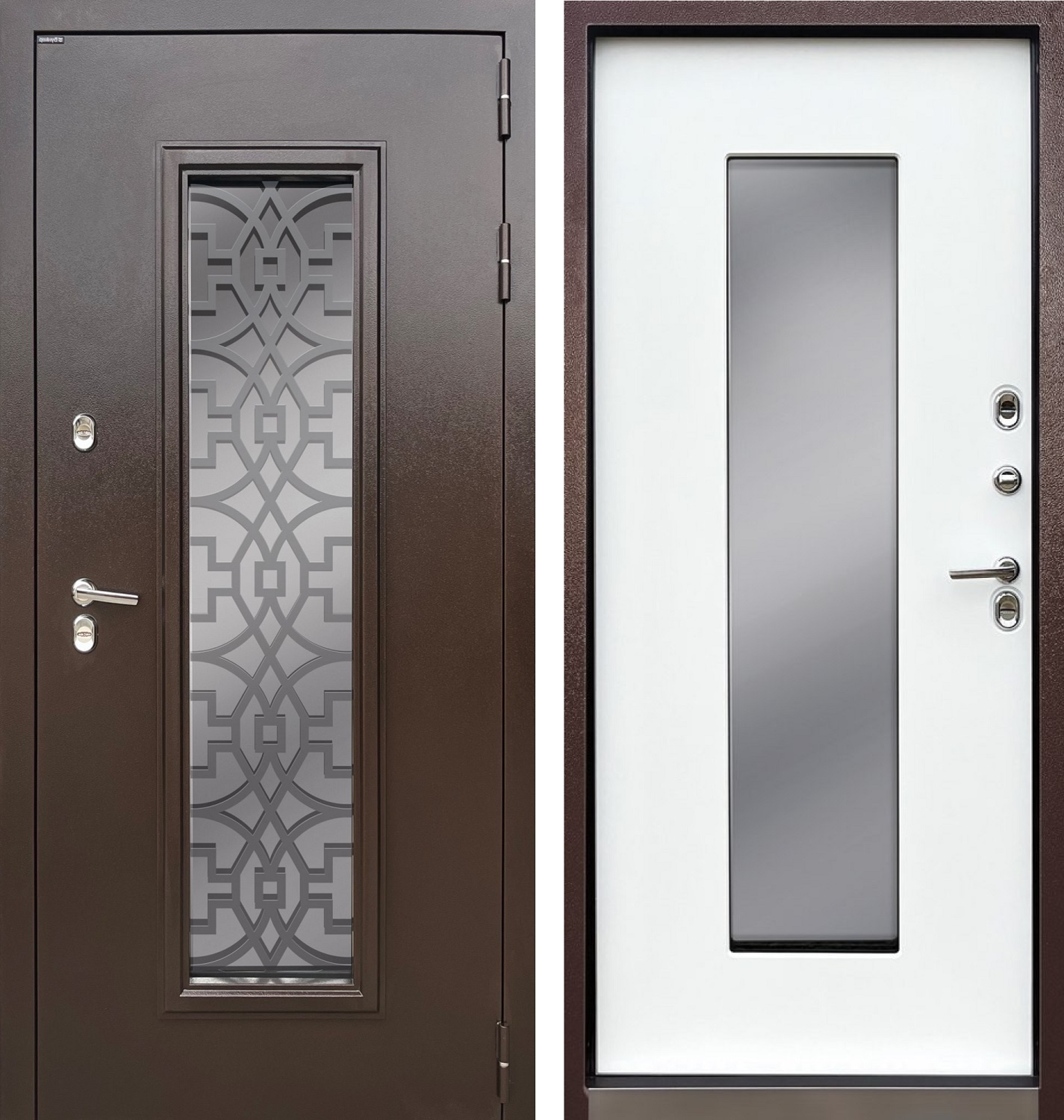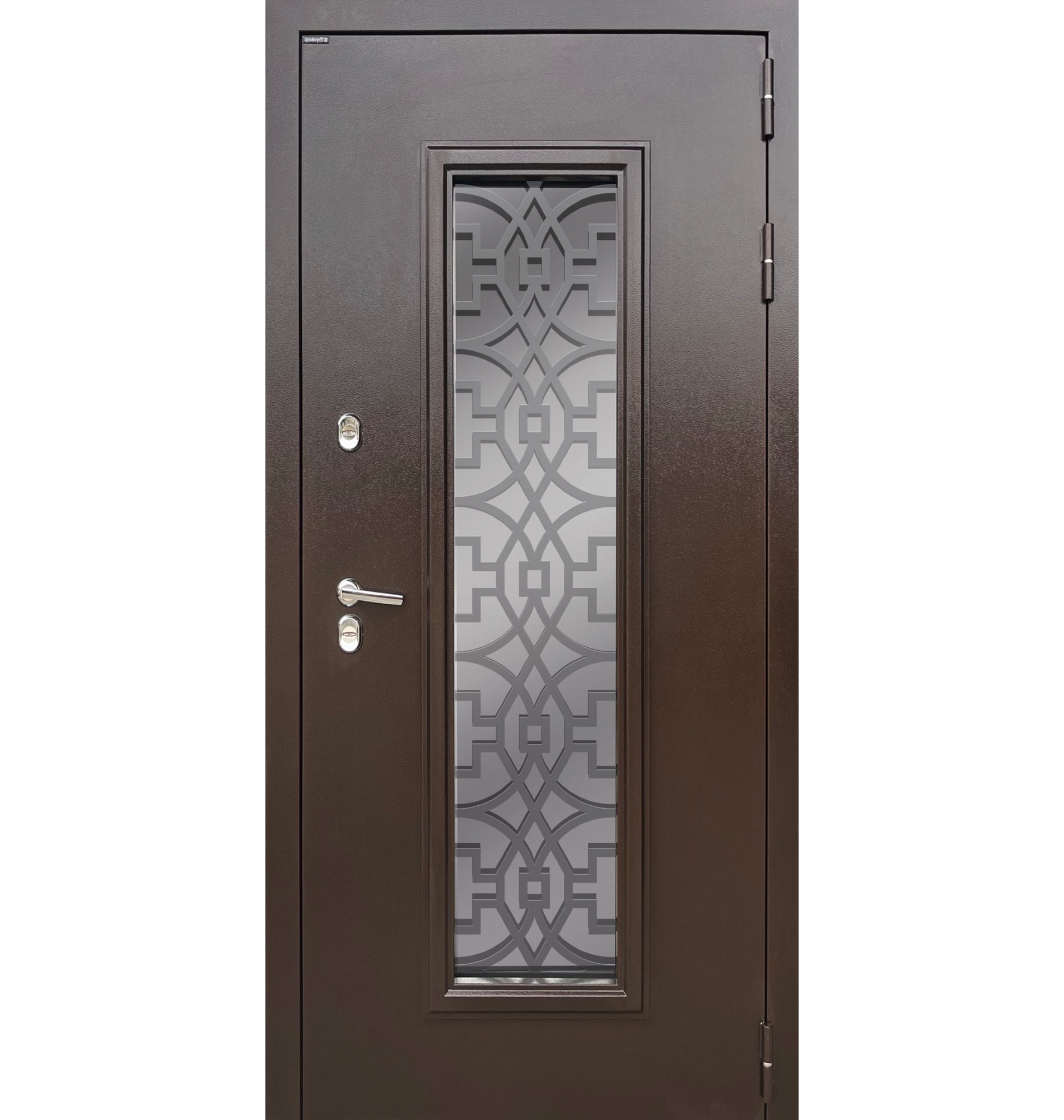 - стеклопакет зеркальный (рефлектив серебро), внутри стеклопакета декоративный элемент из листа металла 3 мм, покрытие чёрный муар