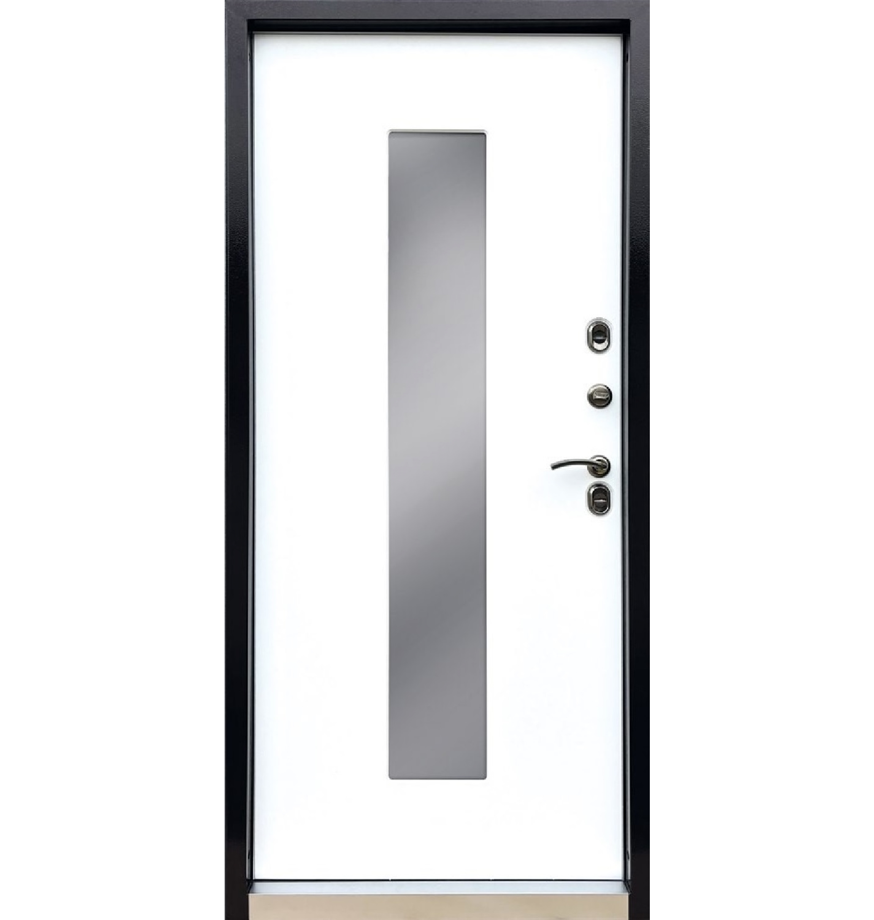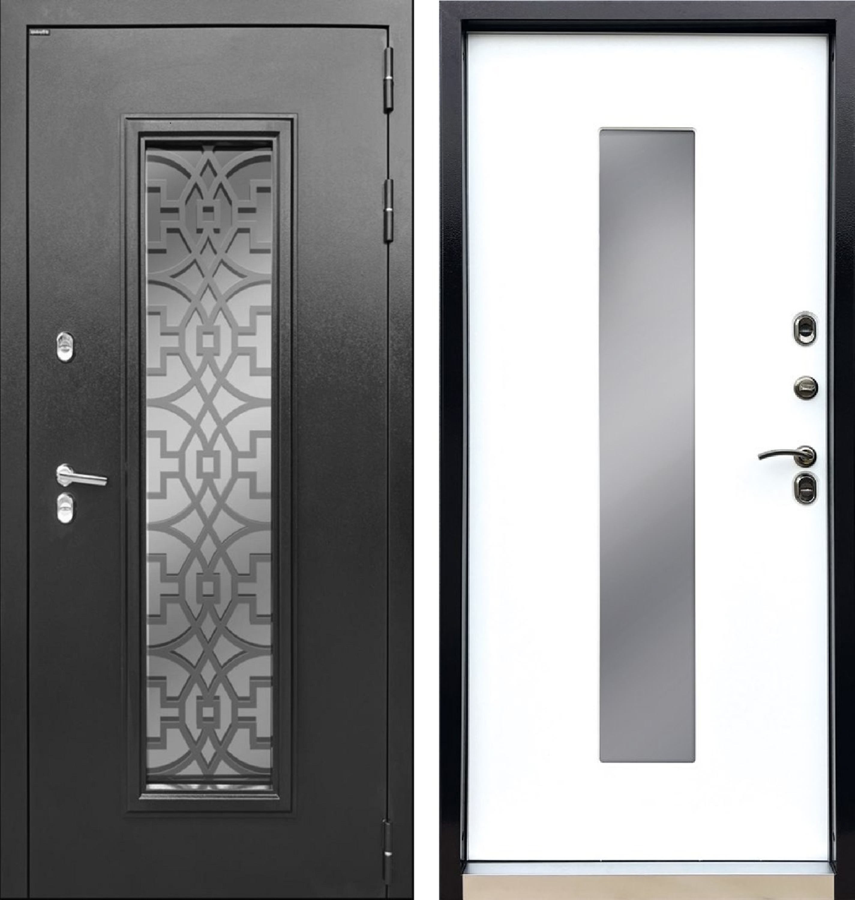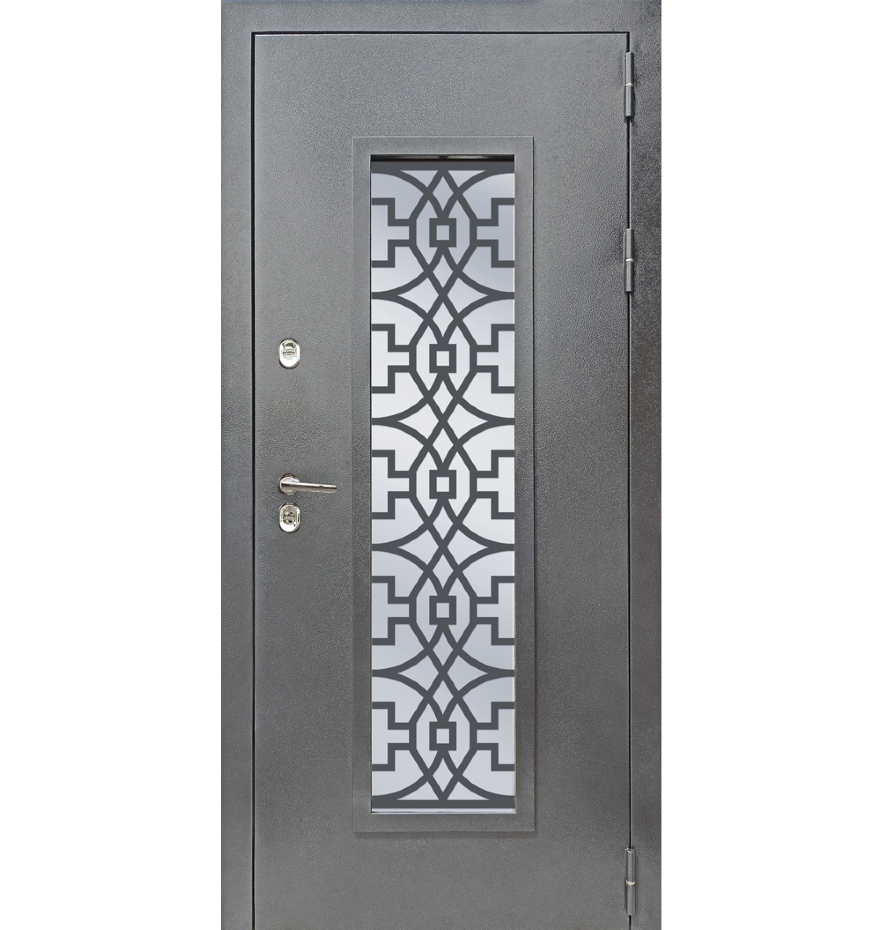 - стеклопакет зеркальный (рефлектив серебро), внутри стеклопакета декоративный элемент из листа металла 3мм, покрытие чёрный муар.